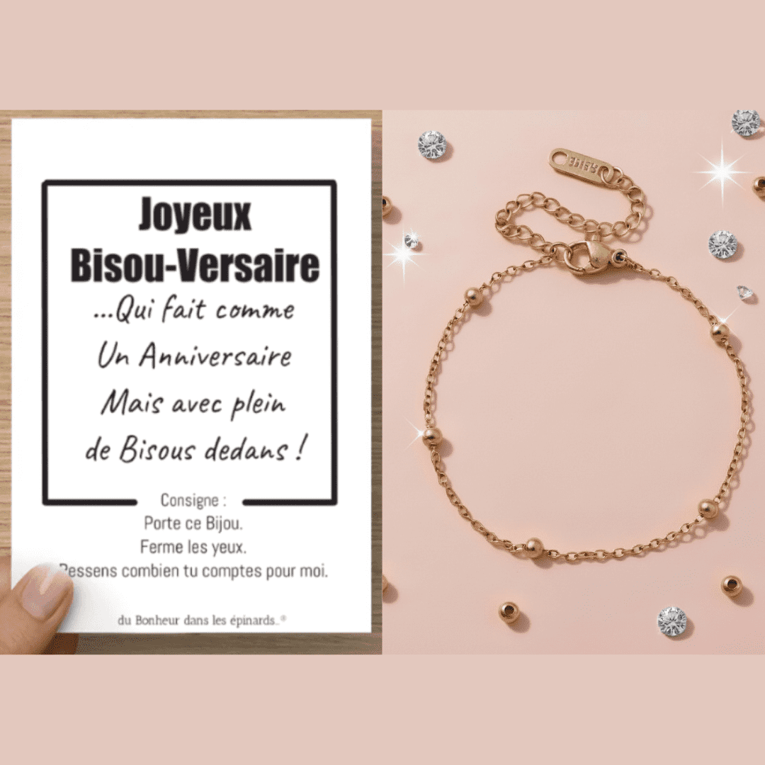 CARTE BISOU VERSAIRE + BRACELET PERLES DOREES - FEMME - A04