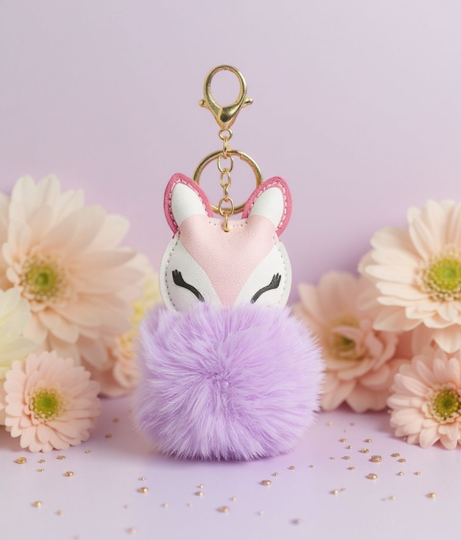 Un Bijou de Sac avec pompon violet et jolie renarde.