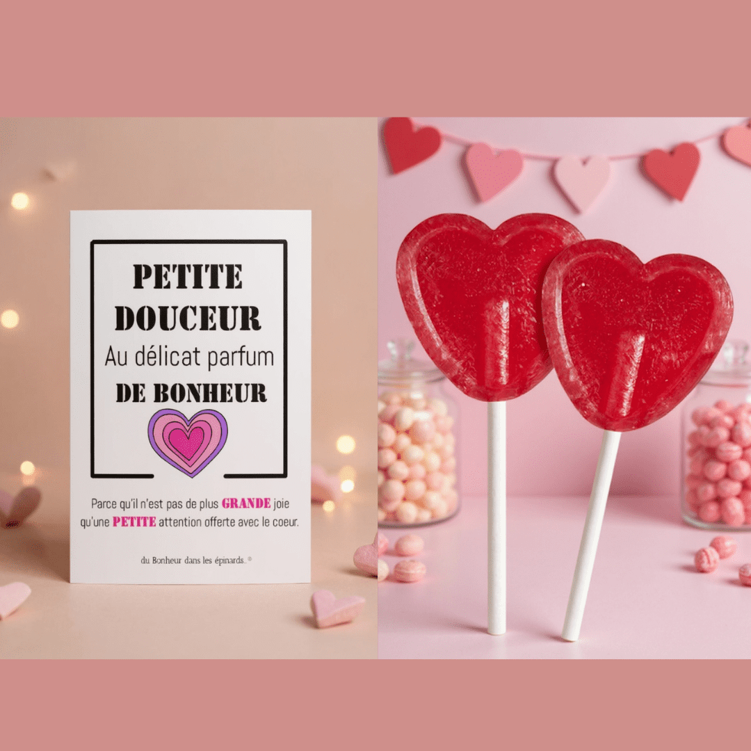 A la fois symbolique & gourmande, optez pour cette Carte + 2 Sucettes COEURS (parfum cerise) qui associe à la fois mots de TENDRESSE + une petite gourmandise !
